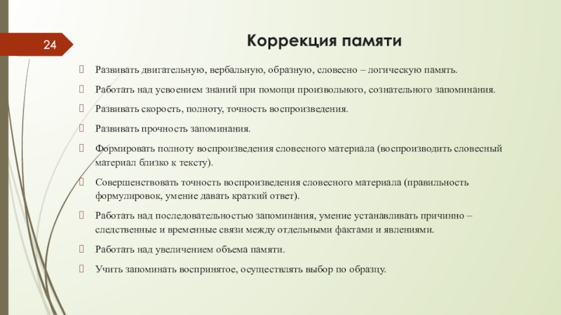 Работать над последовательностью запоминания, умение устанавливать причинно – следственные и временные связи между отдельными фактами и явлениями.