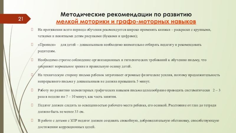 На техническую сторону письма ребенок затрачивает огромные физические усилия, поэтому продолжительность непрерывного письма у дошкольников не должна превышать 5 минут.