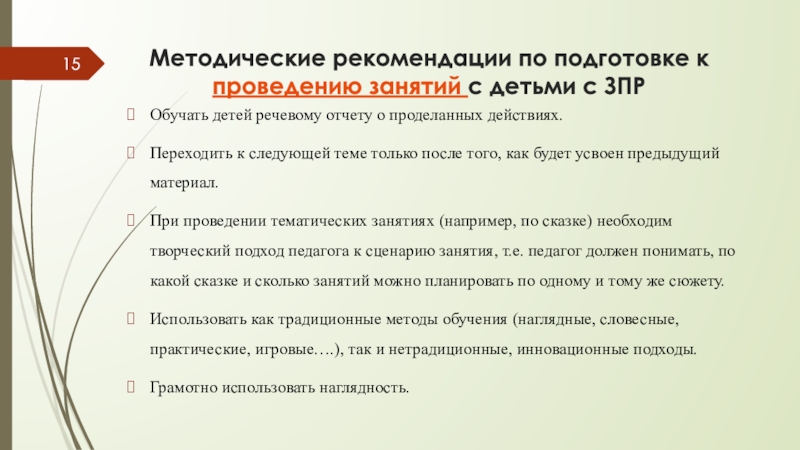 Слайд 15Методические рекомендации по подготовке к проведению занятий с детьми с ЗПР