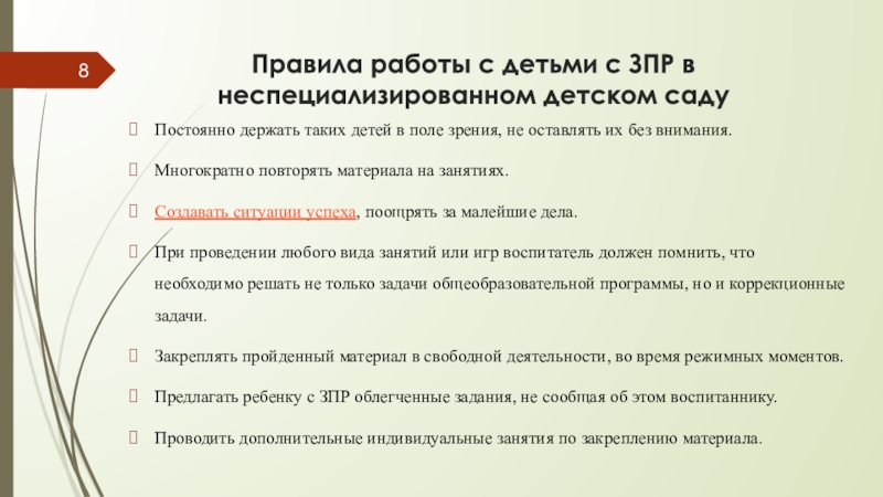 В работе с детьми с ЗПР педагог должен создавать спокойную, доброжелательную обстановку, способствующую достижению коррекционных целей.