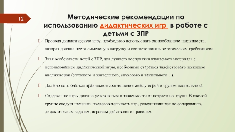 Слайд 12Методические рекомендации по использованию дидактических игр в работе с детьми с ЗПР