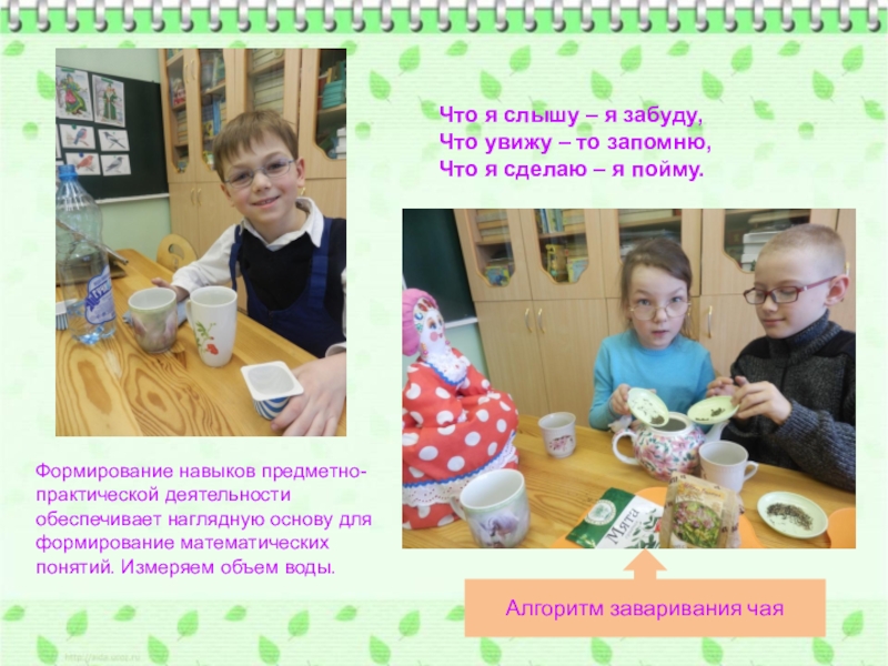 Формирование навыков предметно-практической деятельности обеспечивает наглядную основу для формирование математических понятий. Измеряем объем воды.