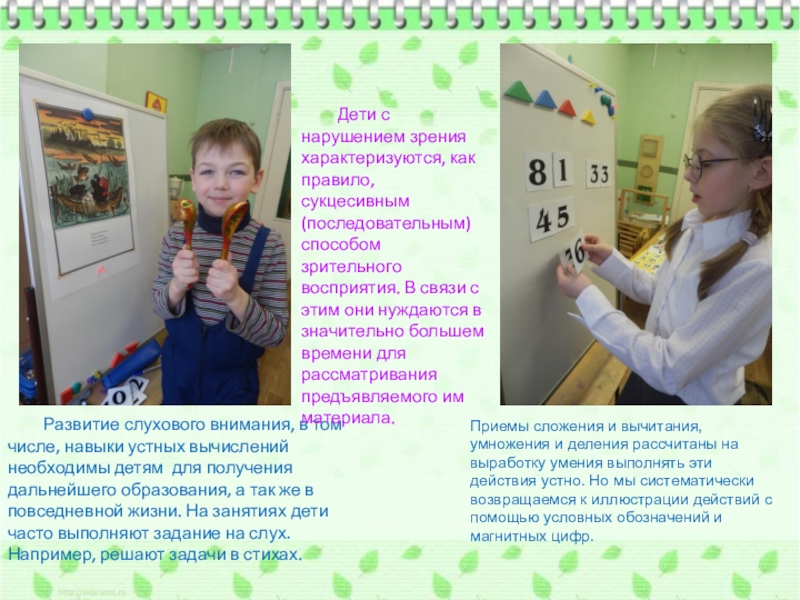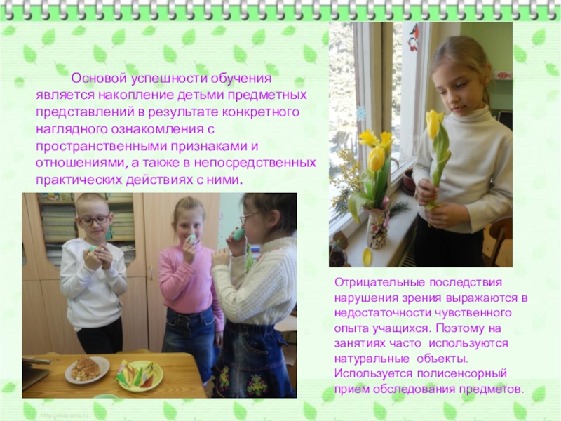 Отрицательные последствия нарушения зрения выражаются в недостаточности чувственного опыта учащихся. Поэтому на занятиях часто используются натуральные объекты. Используется полисенсорный прием обследования предметов.