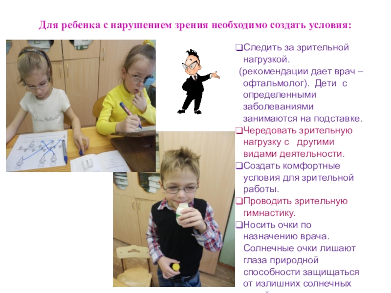 Как сделать так, чтобы ребенок с нарушением зрения не попал в ситуацию неуспешности? «Важно прочно закрепить сформированные умения и навыки использования зрения в школьном возрасте с целью сохранения их на всю жизнь.» Л.П.Григорьева
