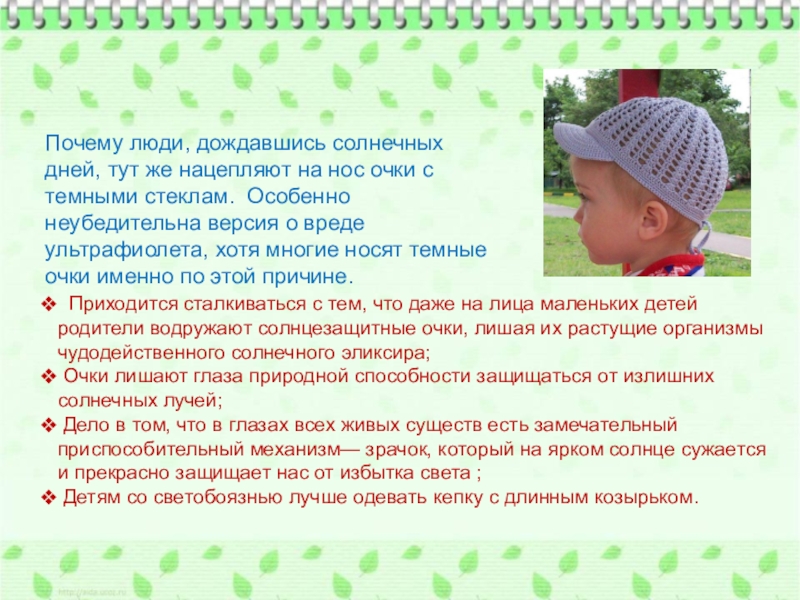 Приходится сталкиваться с тем, что даже на лица маленьких детей родители водружают солнцезащитные очки, лишая их растущие организмы чудодейственного солнечного эликсира;