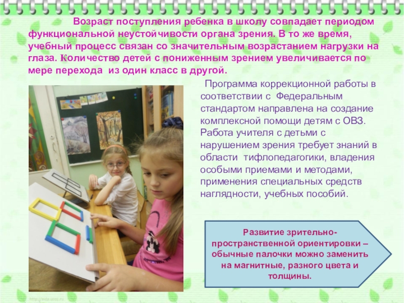 Программа коррекционной работы в соответствии с Федеральным стандартом направлена на создание комплексной помощи детям с ОВЗ. Работа учителя с детьми с нарушением зрения требует знаний в области тифлопедагогики, владения особыми приемами и методами, применения специальных средств наглядности, учебных пособий.