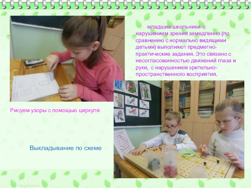 Диспропорциональностью психического развития, в том числе развития логического мышления. Такая диспропорциональность вызвана отсутствием у детей приемов и способов компенсации зрительной недостаточности. Этому детей следует обучать. Прекращение коррекционных занятий в школе приводит к ухудшению зрительного восприятия и представлений, что связано с неустойчивостью образов.