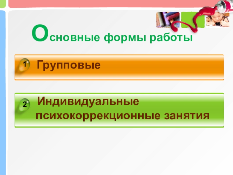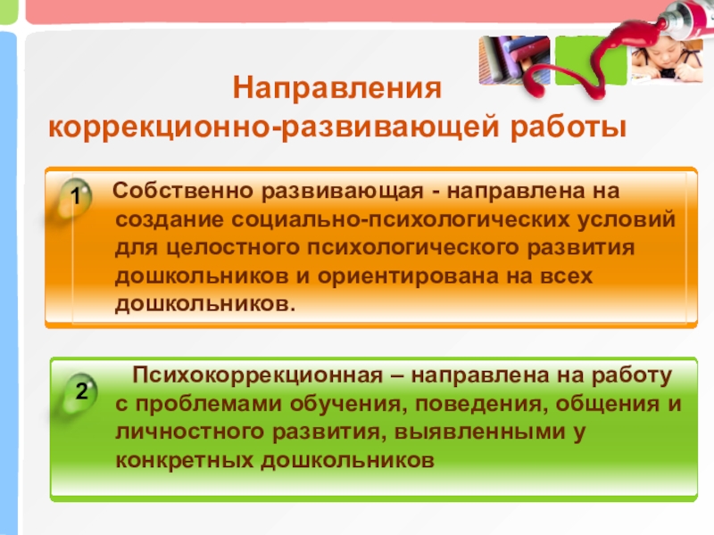 Психокоррекционная – направлена на работу с проблемами обучения, поведения, общения и личностного развития, выявленными у конкретных дошкольников