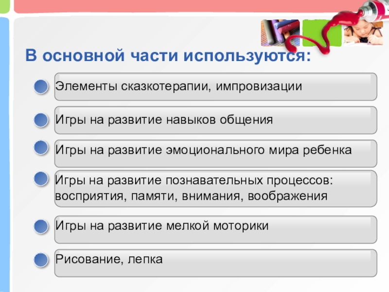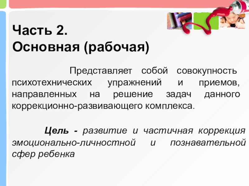 Цель - развитие и частичная коррекция эмоционально-личностной и познавательной сфер ребенка