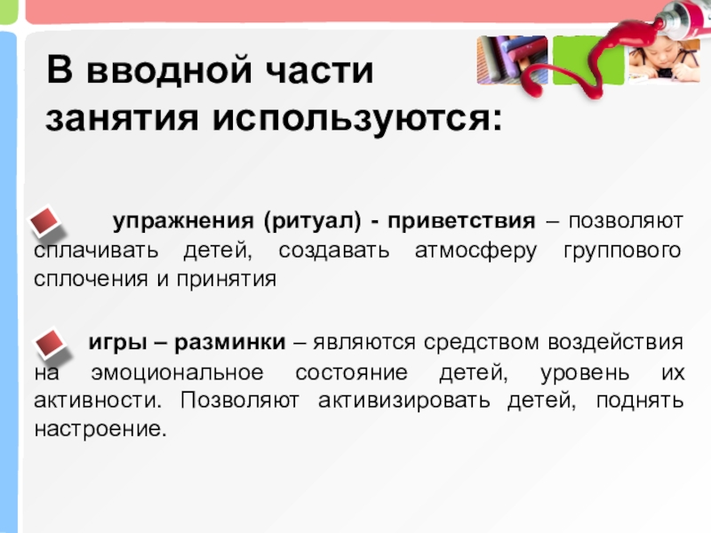 игры – разминки – являются средством воздействия на эмоциональное состояние детей, уровень их активности. Позволяют активизировать детей, поднять настроение.