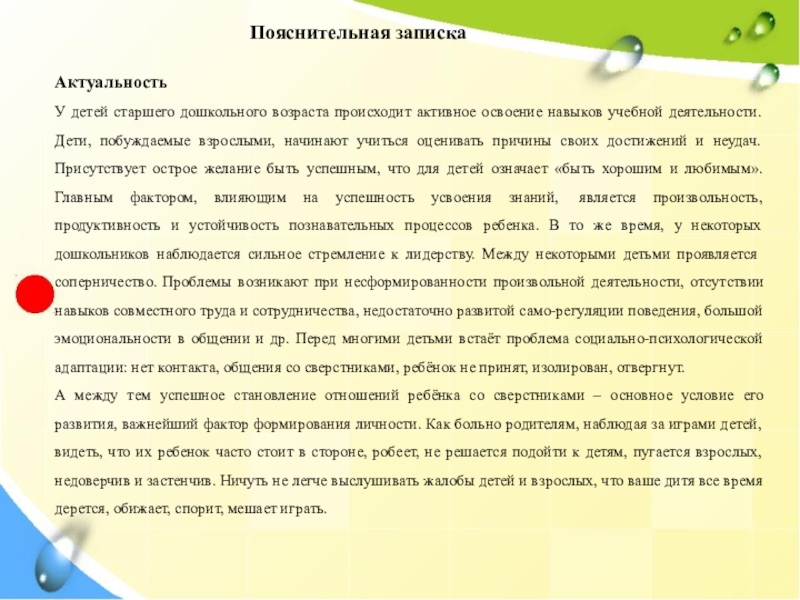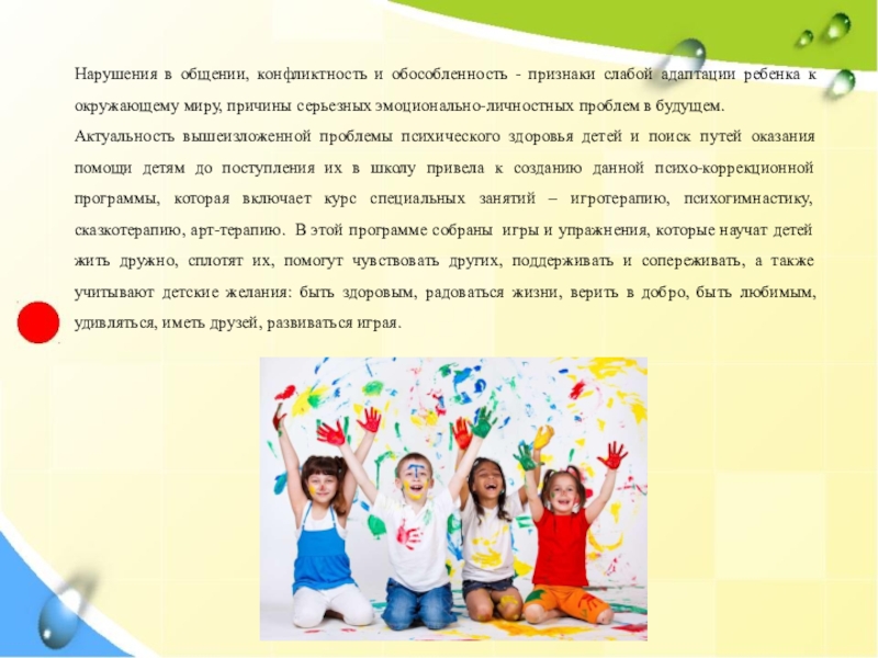 Актуальность вышеизложенной проблемы психического здоровья детей и поиск путей оказания помощи детям до поступления их в школу привела к созданию данной психо-коррекционной программы, которая включает курс специальных занятий – игротерапию, психогимнастику, сказкотерапию, арт-терапию. В этой программе собраны игры и упражнения, которые научат детей жить дружно, сплотят их, помогут чувствовать других, поддерживать и сопереживать, а также учитывают детские желания: быть здоровым, радоваться жизни, верить в добро, быть любимым, удивляться, иметь друзей, развиваться играя.