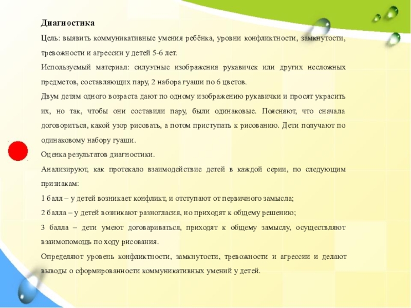 Цель: выявить коммуникативные умения ребёнка, уровни конфликтности, замкнутости, тревожности и агрессии
