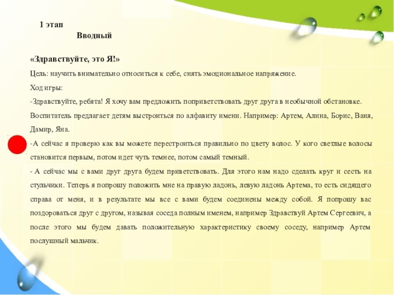 - А сейчас мы с вами друг друга будем приветствовать. Для этого нам надо сделать круг и сесть на стульчики. Теперь я попрошу положить мне на правую ладонь, левую ладонь Артема, то есть сидящего справа от меня, и в результате мы все с вами будем соединены между собой. Я попрошу вас поздороваться друг с другом, называя соседа полным именем, например Здравствуй Артем Сергеевич, а после этого мы будем давать положительную характеристику своему соседу, например Артем послушный мальчик.