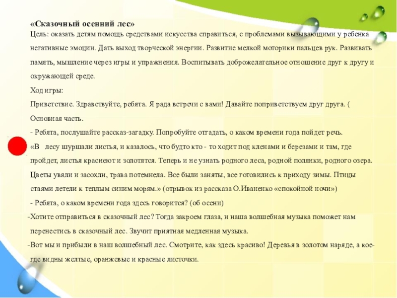 Завершающим штрихом, подводящим черту под игровым занятием, становится ритуал прощания. Используется тихая спокойная музыка. Дети встают в круг, берутся за руки и передают друг другу хорошее настроение на целый день.