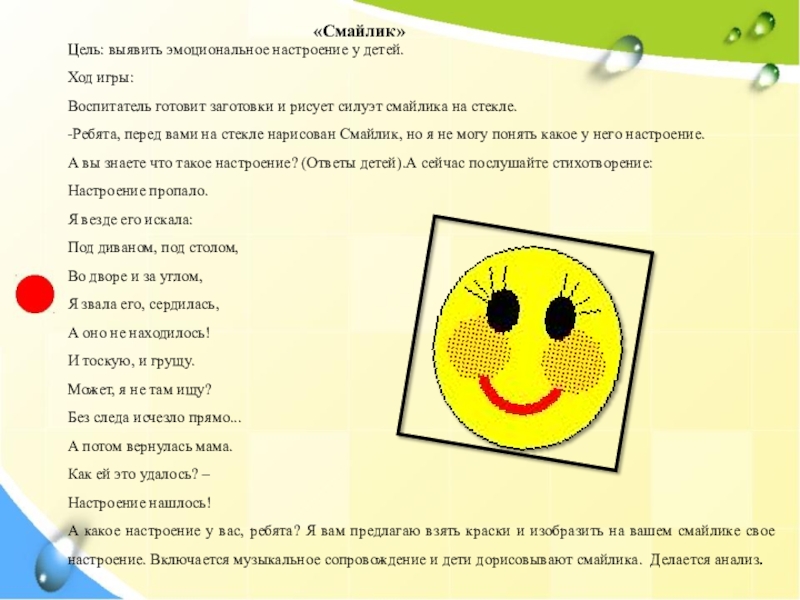А какое настроение у вас, ребята? Я вам предлагаю взять краски и изобразить на вашем смайлике свое настроение. Включается музыкальное сопровождение и дети дорисовывают смайлика. Делается анализ.