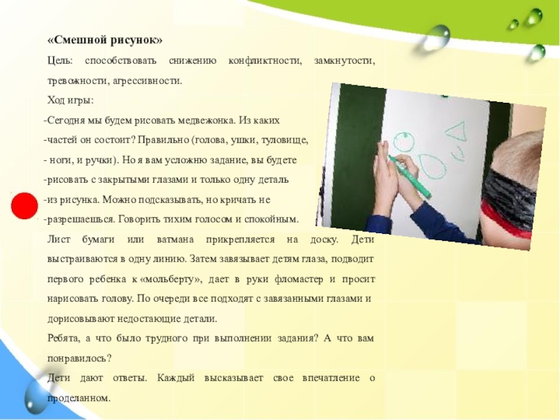 Лист бумаги или ватмана прикрепляется на доску. Дети выстраиваются в одну линию. Затем завязывает детям глаза, подводит первого ребенка к «мольберту», дает в руки фломастер и просит нарисовать голову. По очереди все подходят с завязанными глазами и дорисовывают недостающие детали.