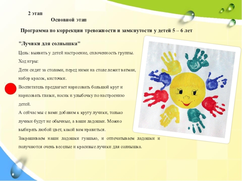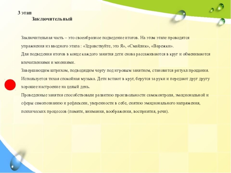 своеобразное подведение итогов. На этом этапе проводятся упражнения из вводного этапа : «Здравствуйте, это Я», «Смайлик», «Варежки».