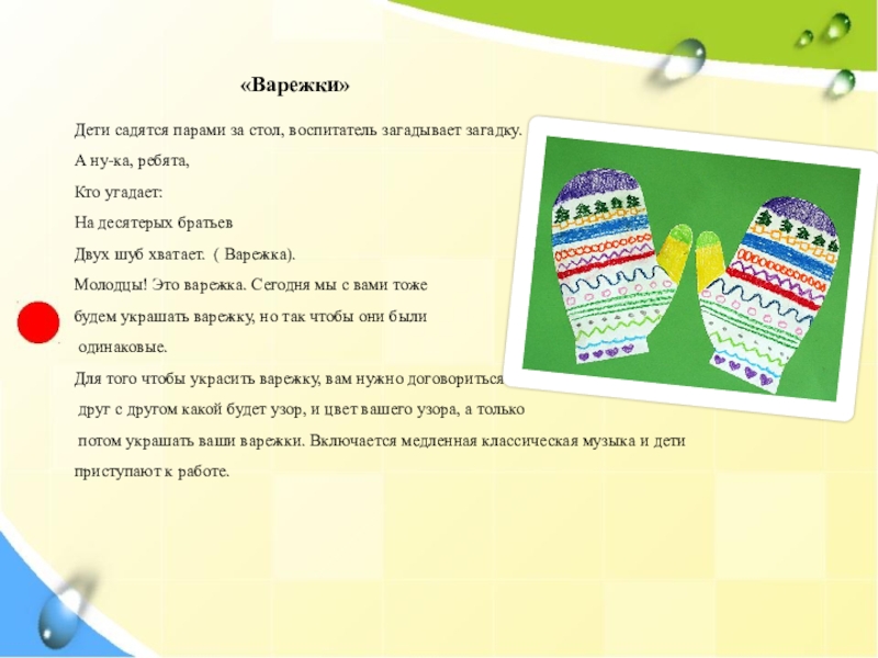 потом украшать ваши варежки. Включается медленная классическая музыка и дети приступают к работе.