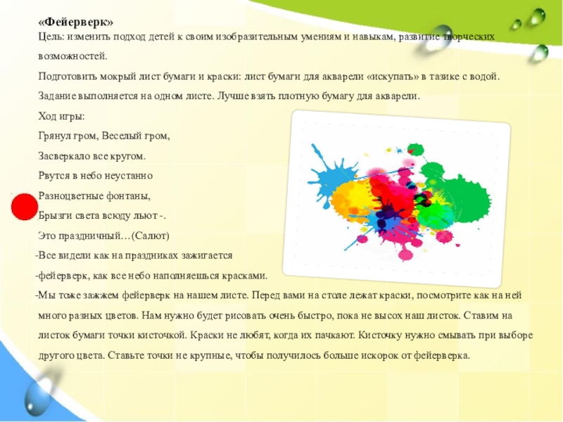 Мы тоже зажжем фейерверк на нашем листе. Перед вами на столе лежат краски, посмотрите как на ней много разных цветов. Нам нужно будет рисовать очень быстро, пока не высох наш листок. Ставим на листок бумаги точки кисточкой. Краски не любят, когда их пачкают. Кисточку нужно смывать при выборе другого цвета. Ставьте точки не крупные, чтобы получилось больше искорок от фейерверка.