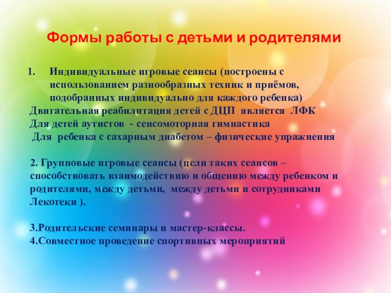 2. Групповые игровые сеансы (цели таких сеансов – способствовать взаимодействию и общению между ребенком и родителями, между детьми, между детьми и сотрудниками Лекотеки ).