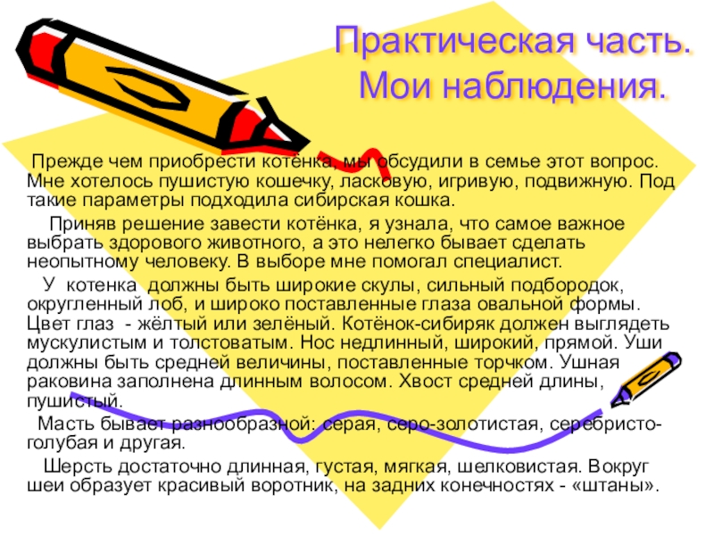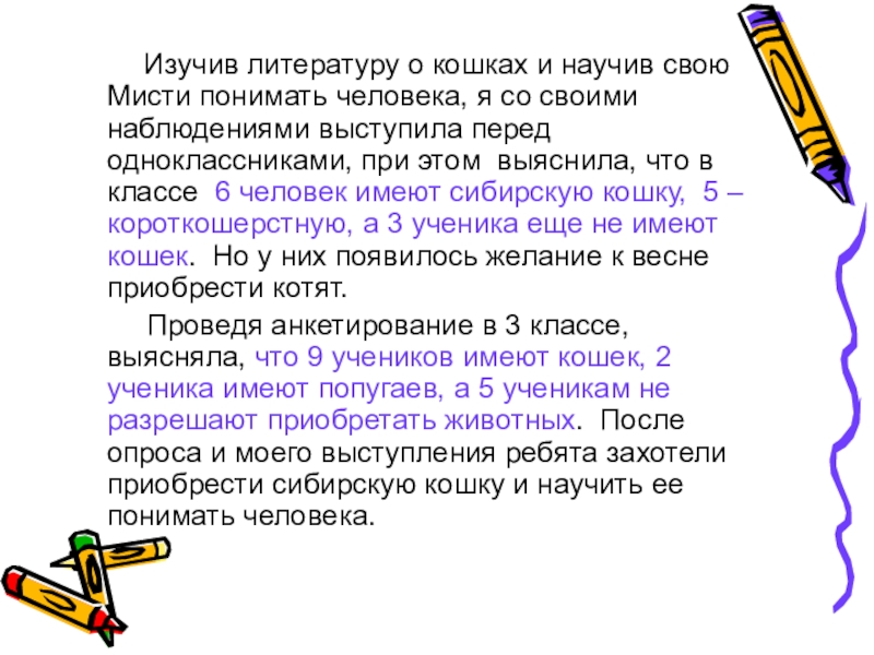 Проведя анкетирование в 3 классе, выясняла, что 9 учеников имеют кошек, 2 ученика имеют попугаев, а 5 ученикам не разрешают приобретать животных. После опроса и моего выступления ребята захотели приобрести сибирскую кошку и научить ее понимать человека.