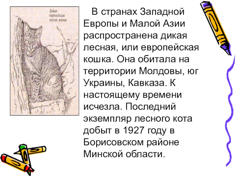 лесная, или европейская кошка. Она обитала на территории Молдовы, юг Украины, Кавказа. К настоящему времени исчезла. Последний экземпляр лесного кота добыт в 1927 году в Борисовском районе Минской области.