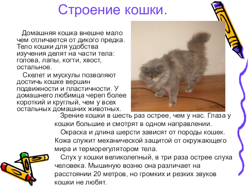 от дикого предка. Тело кошки для удобства изучения делят на части тела: голова, лапы, когти, хвост, остальное.