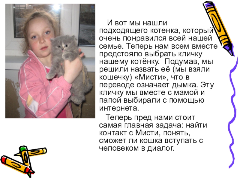 очень понравился всей нашей семье. Теперь нам всем вместе предстояло выбрать кличку нашему котёнку. Подумав, мы решили назвать её (мы взяли кошечку) «Мисти», что в переводе означает дымка. Эту кличку мы вместе с мамой и папой выбирали с помощью интернета.