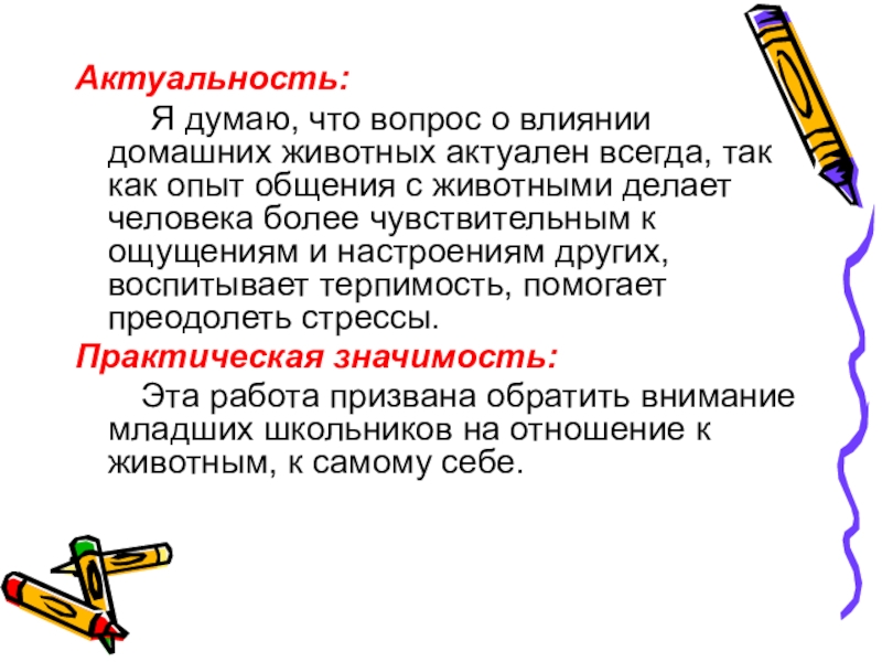 животных актуален всегда, так как опыт общения с животными делает человека более чувствительным к ощущениям и настроениям других, воспитывает терпимость, помогает преодолеть стрессы.
