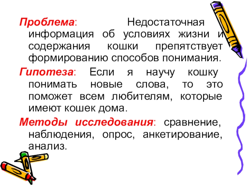 Слайд 4Проблема: Недостаточная информация об условиях жизни и содержания кошки препятствует формированию