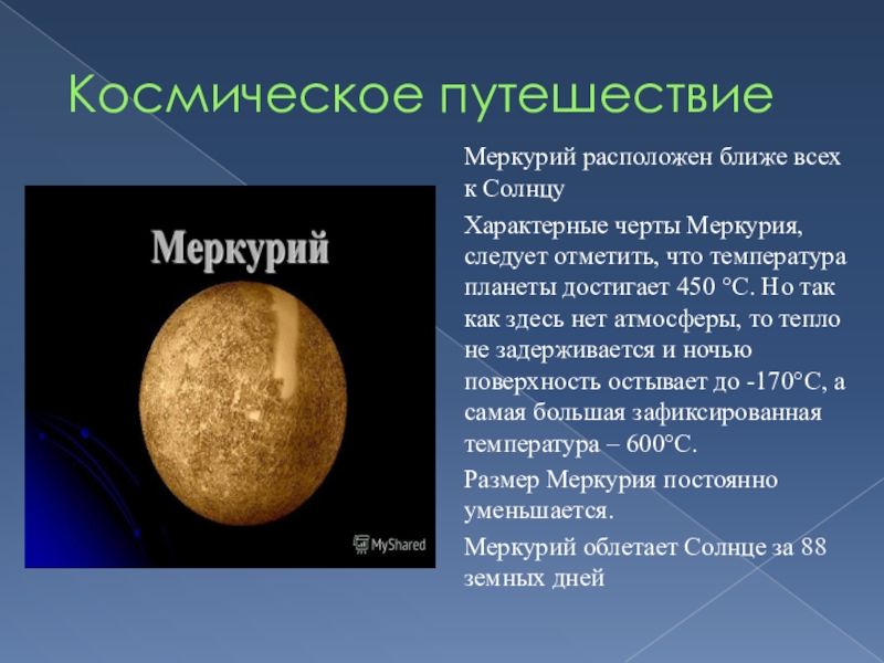 Характерные черты Меркурия, следует отметить, что температура планеты достигает 450 °C. Но так как здесь нет атмосферы, то тепло не задерживается и ночью поверхность остывает до -170°C, а самая большая зафиксированная температура – 600°C.