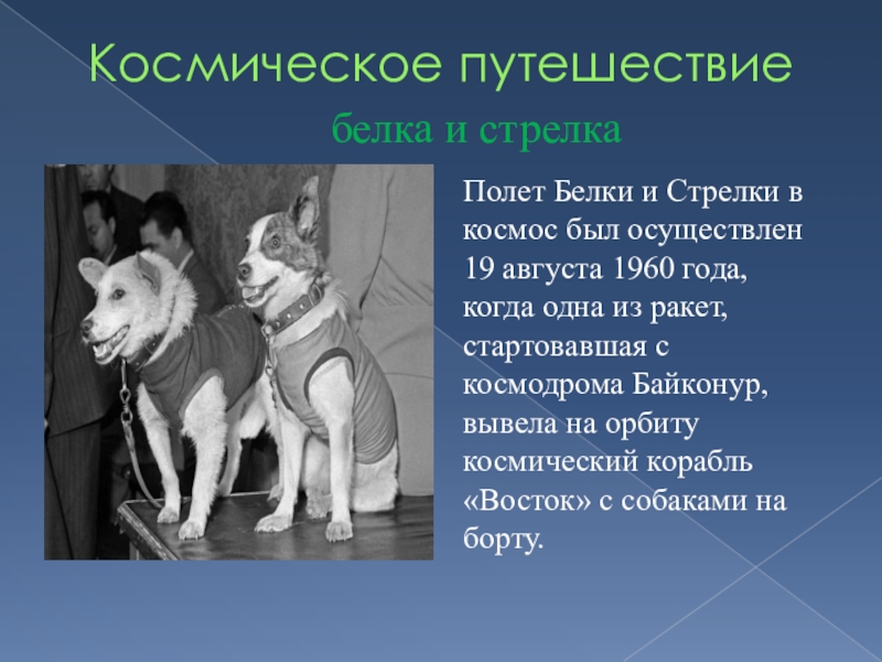Полет Белки и Стрелки в космос был осуществлен 19 августа 1960 года, когда одна из ракет, стартовавшая с космодрома Байконур, вывела на орбиту космический корабль «Восток» с собаками на борту.