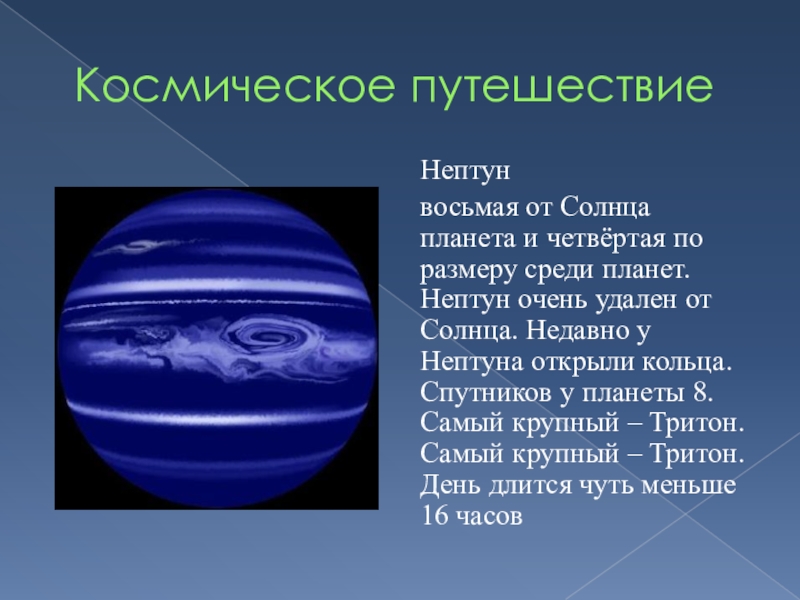среди планет. Нептун очень удален от Солнца. Недавно у Нептуна открыли кольца. Спутников у планеты 8. Самый крупный – Тритон. Самый крупный – Тритон. День длится чуть меньше 16 часов