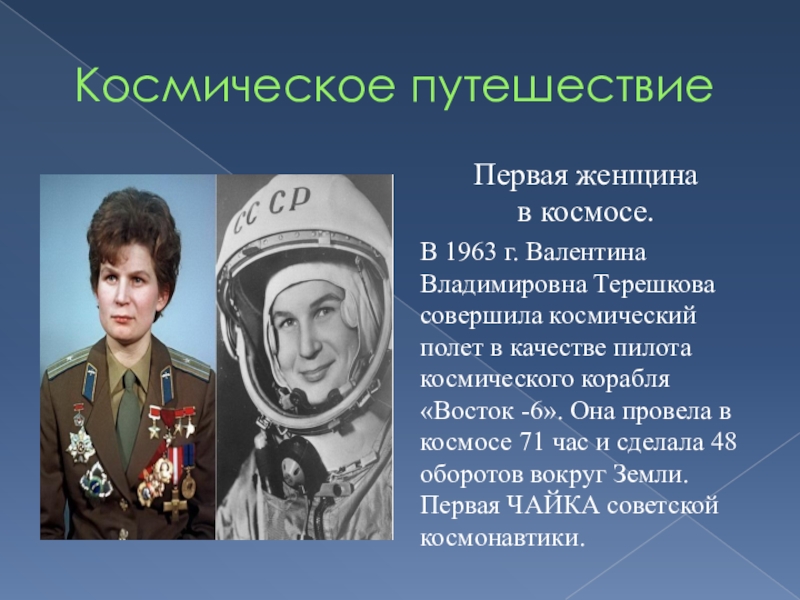 В 1963 г. Валентина Владимировна Терешкова совершила космический полет в качестве пилота космического корабля «Восток -6». Она провела в космосе 71 час и сделала 48 оборотов вокруг Земли. Первая ЧАЙКА советской космонавтики.