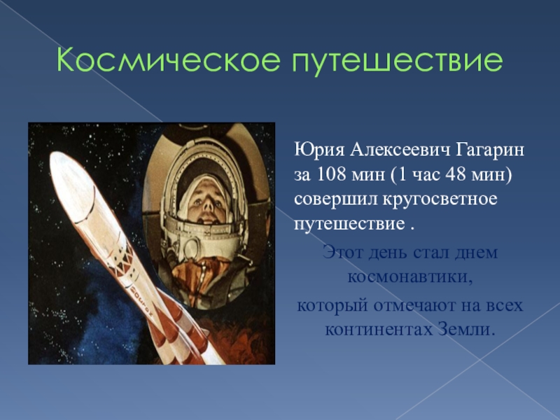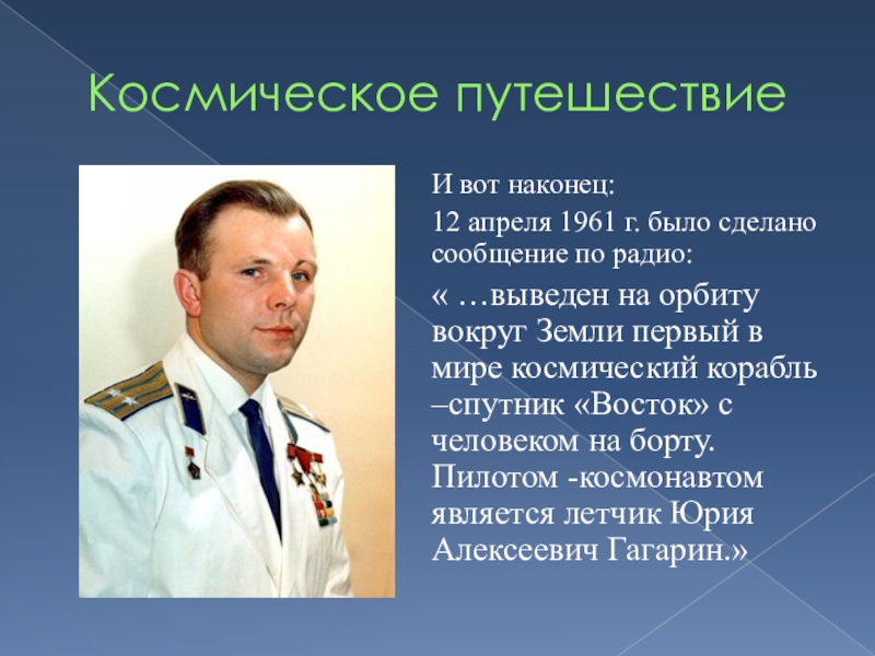 « …выведен на орбиту вокруг Земли первый в мире космический корабль –спутник «Восток» с человеком на борту. Пилотом -космонавтом является летчик Юрия Алексеевич Гагарин.»