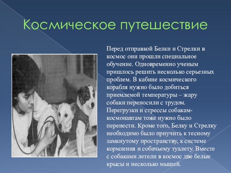 обучение. Одновременно ученым пришлось решить несколько серьезных проблем. В кабине космического корабля нужно было добиться приемлемой температуры – жару собаки переносили с трудом. Перегрузки и стрессы собакам-космонавтам тоже нужно было перенести. Кроме того, Белку и Стрелку необходимо было приучить к тесному замкнутому пространству, к системе кормления и собачьему туалету. Вместе с собаками летели в космос две белые крысы и несколько мышей.