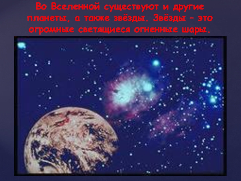 Во Вселенной существуют и другие планеты, а также звёзды. Звёзды – это огромные светящиеся огненные шары.