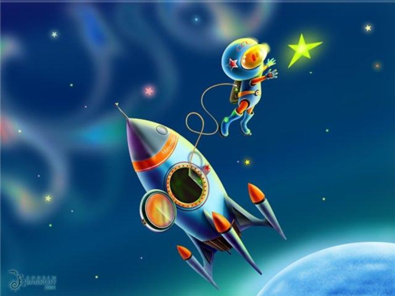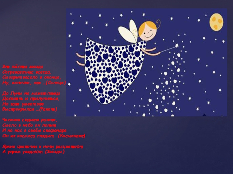 Луны не может птица Долететь и прилуниться, Но зато умеет это Быстрокрылая …(Ракета)   Человек сидит в ракете, Смело в небо он летит, И на нас в своём скафандре Он из космоса глядит. (Космонавт) Яркие цветочки к ночи расцветают, А утром увядают. (Звёзды)