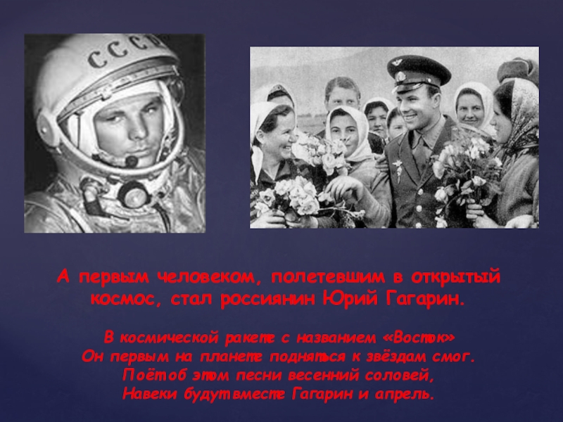 В космической ракете с названием «Восток» Он первым на планете подняться к звёздам смог. Поёт об этом песни весенний соловей, Навеки будут вместе Гагарин и апрель.