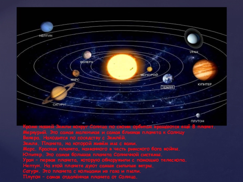 планет. Меркурий. Это самая маленькая и самая близкая планета к Солнцу Венера. Находится по соседству с Землёй. Земля. Планета, на которой живём мы с вами. Марс. Красная планета, названного в честь римского бога войны. Юпитер. Это самая большая планета Солнечной системы. Уран – первая планета, которую обнаружили с помощью телескопа. Нептун. На этой планете дуют самые сильные ветры. Сатурн. Это планета с кольцами из газа и пыли. Плутон – самая отдалённая планета от Солнца.