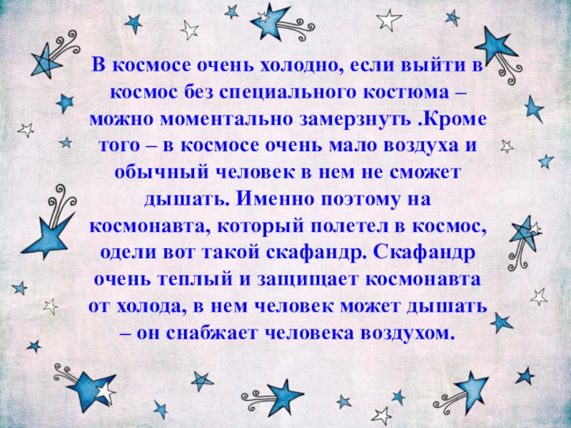 – можно моментально замерзнуть .Кроме того – в космосе очень мало воздуха и обычный человек в нем не сможет дышать. Именно поэтому на космонавта, который полетел в космос, одели вот такой скафандр. Скафандр очень теплый и защищает космонавта от холода, в нем человек может дышать – он снабжает человека воздухом.