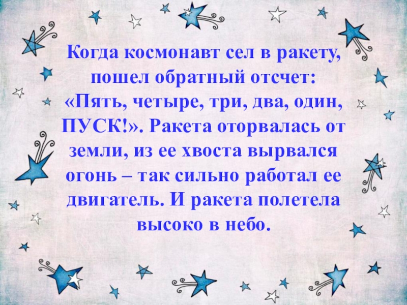 Слайд 8Когда космонавт сел в ракету, пошел обратный отсчет: «Пять, четыре, три,