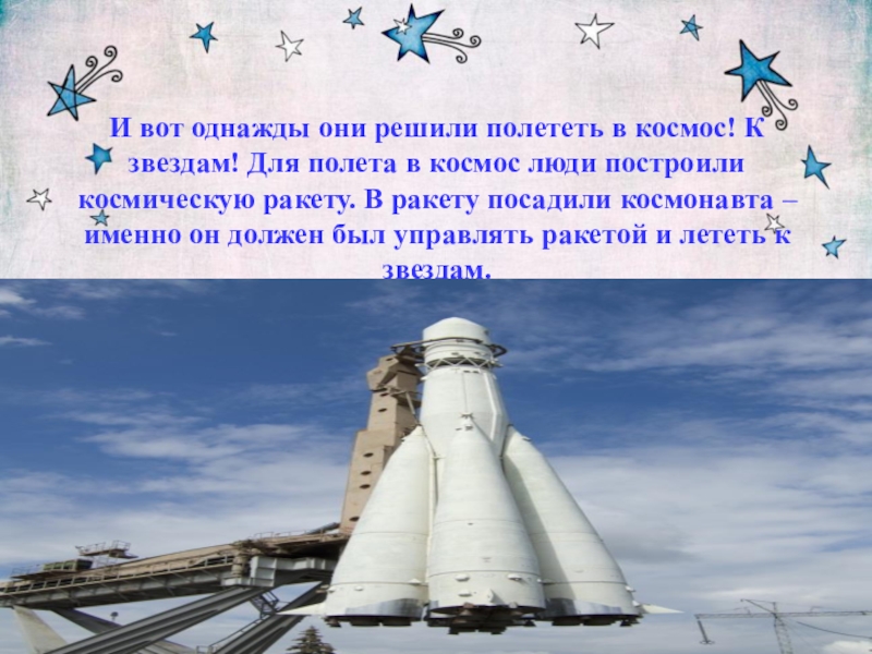 полета в космос люди построили космическую ракету. В ракету посадили космонавта – именно он должен был управлять ракетой и лететь к звездам.