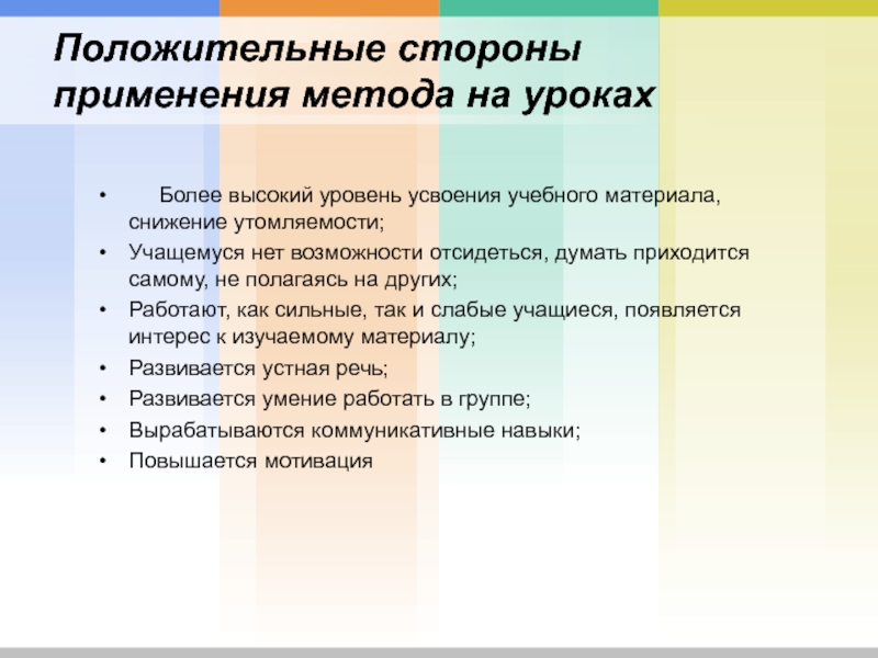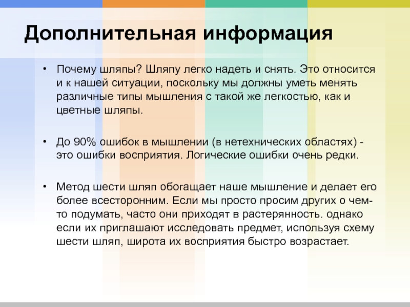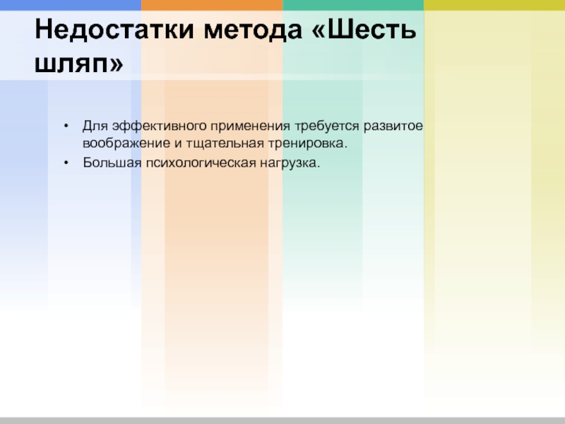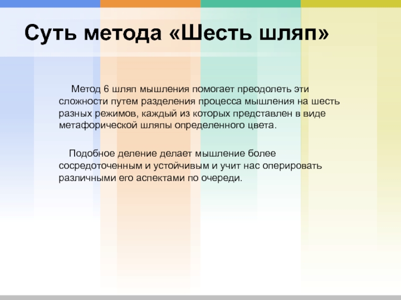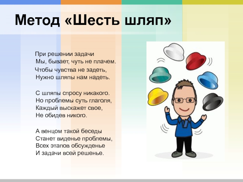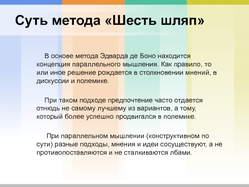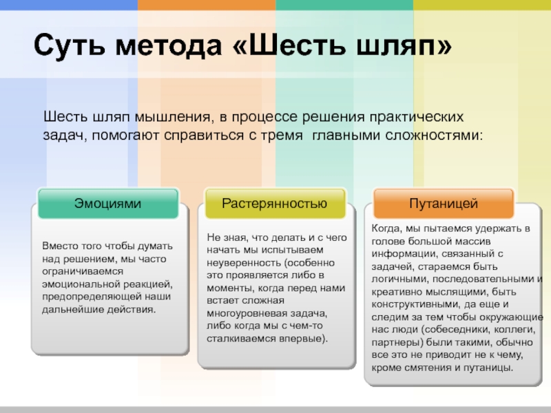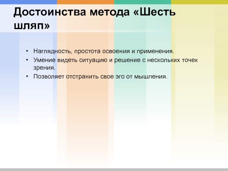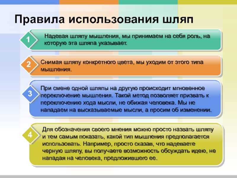 При смене одной шляпы на другую происходит мгновенное переключение мышления. Такой метод позволяет призвать к переключению хода мысли, не обижая человека. Мы не нападаем на высказываемые мысли, а просим об изменении.