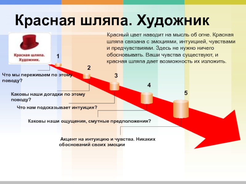Красный цвет наводит на мысль об огне. Красная шляпа связана с эмоциями, интуицией, чувствами и предчувствиями. Здесь не нужно ничего обосновывать. Ваши чувства существуют, и красная шляпа дает возможность их изложить.