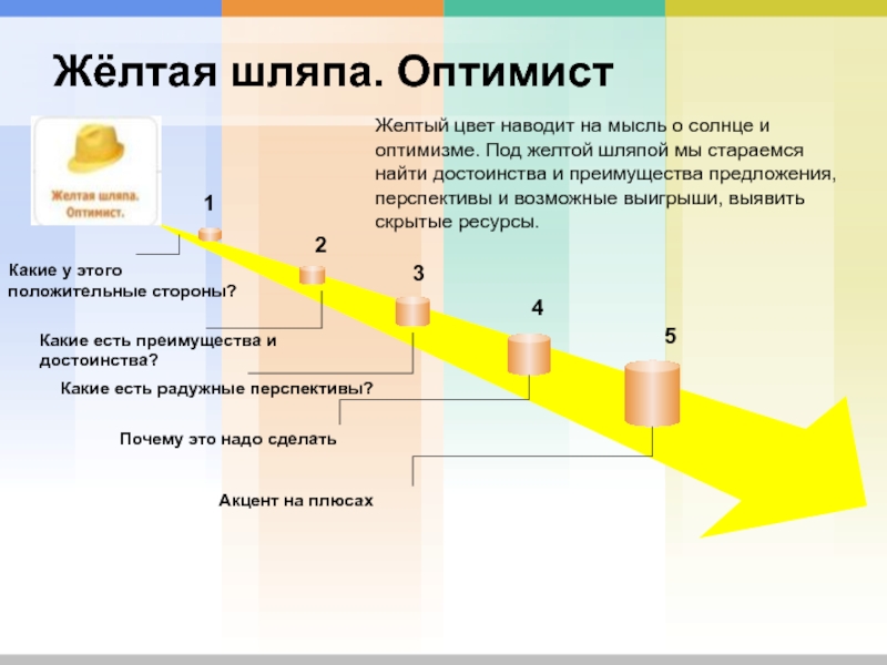 Желтый цвет наводит на мысль о солнце и оптимизме. Под желтой шляпой мы стараемся найти достоинства и преимущества предложения, перспективы и возможные выигрыши, выявить скрытые ресурсы.