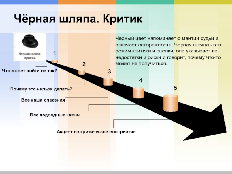 Черный цвет напоминает о мантии судьи и означает осторожность. Черная шляпа - это режим критики и оценки, она указывает на недостатки и риски и говорит, почему что-то может не получиться.
