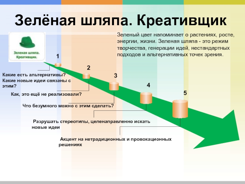 Зеленый цвет напоминает о растениях, росте, энергии, жизни. Зеленая шляпа - это режим творчества, генерации идей, нестандартных подходов и альтернативных точек зрения.