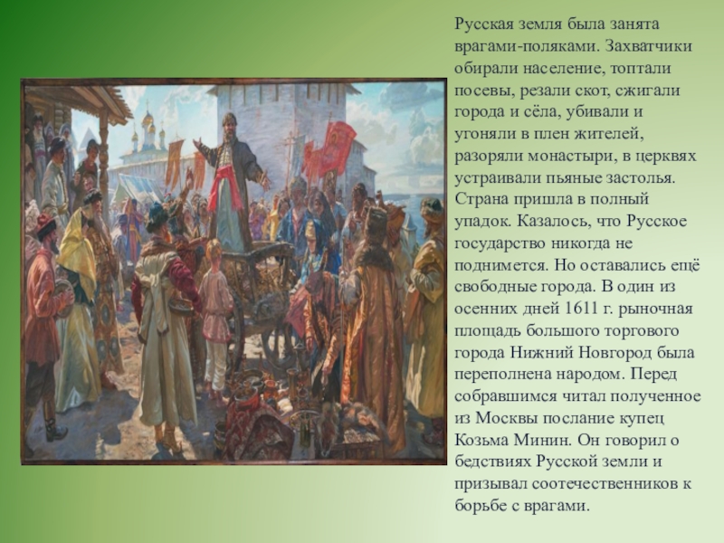 Страна пришла в полный упадок. Казалось, что Русское государство никогда не поднимется. Но оставались ещё свободные города. В один из осенних дней 1611 г. рыночная площадь большого торгового города Нижний Новгород была переполнена народом. Перед собравшимся читал полученное из Москвы послание купец Козьма Минин. Он говорил о бедствиях Русской земли и призывал соотечественников к борьбе с врагами.