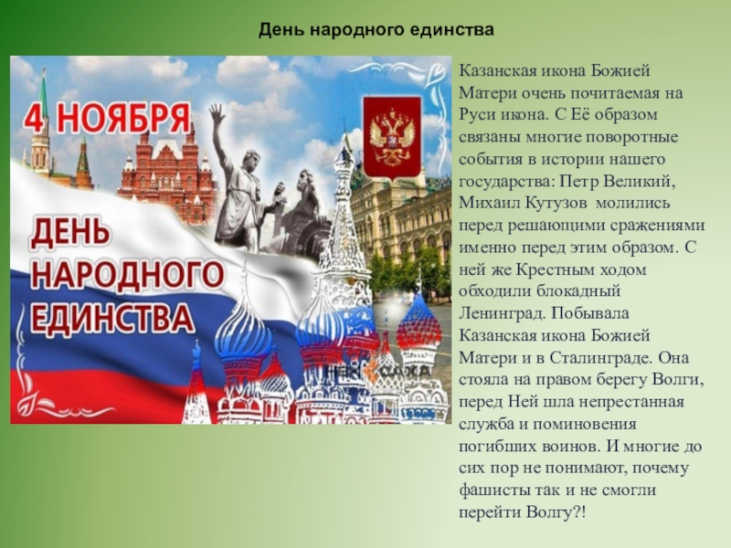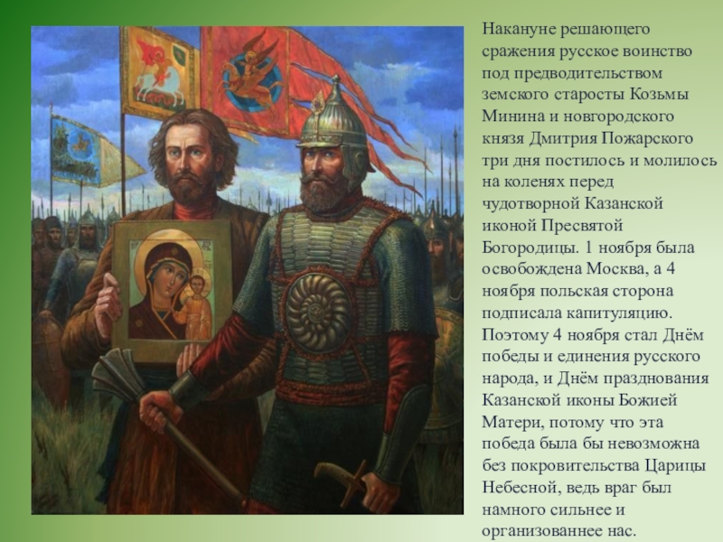 и новгородского князя Дмитрия Пожарского три дня постилось и молилось на коленях перед чудотворной Казанской иконой Пресвятой Богородицы. 1 ноября была освобождена Москва, а 4 ноября польская сторона подписала капитуляцию. Поэтому 4 ноября стал Днём победы и единения русского народа, и Днём празднования Казанской иконы Божией Матери, потому что эта победа была бы невозможна без покровительства Царицы Небесной, ведь враг был намного сильнее и организованнее нас.